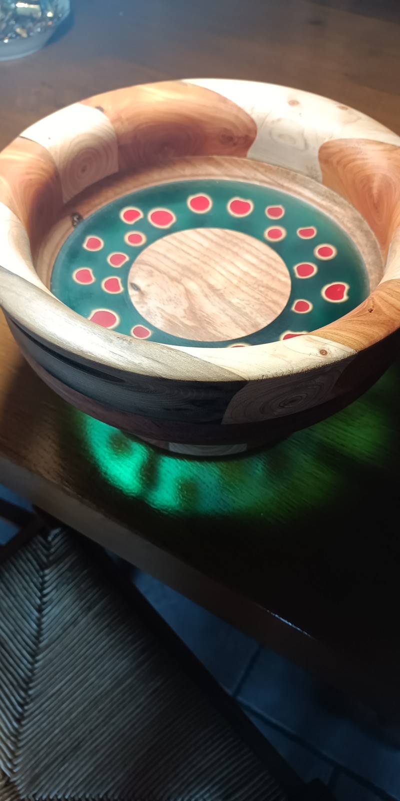 Très originale coupe a fruit en frêne bords et pieds en bois mélangés résine verte translucide ,incrustation bambou et résine rouge.