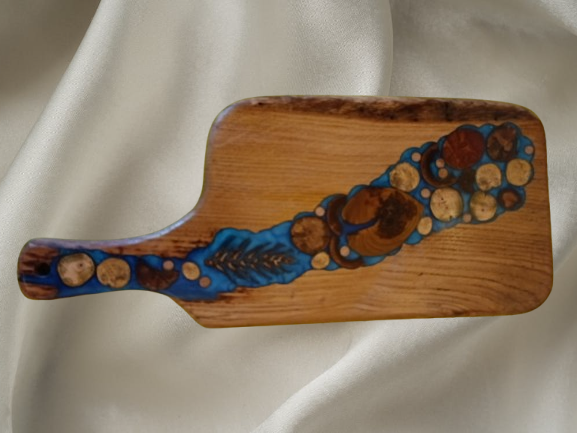 Planche apéritif en chêne incrustation divers bois et pomme de pin dans résine