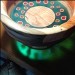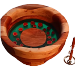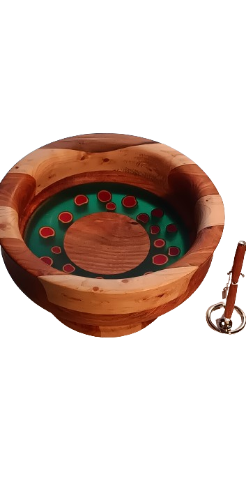 Très originale coupe a fruit en frêne bords et pieds en bois mélangés résine verte translucide ,incrustation bambou et résine rouge.