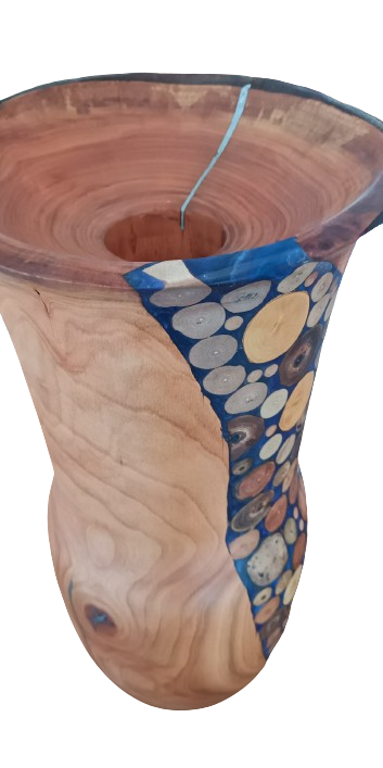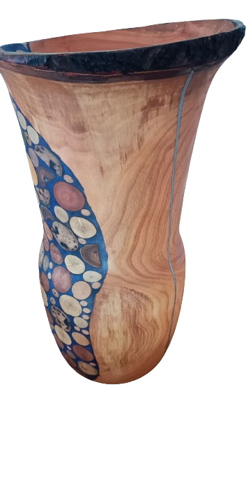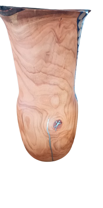 Grand et original vase en cerisier avec incrustation bois/résine et etain